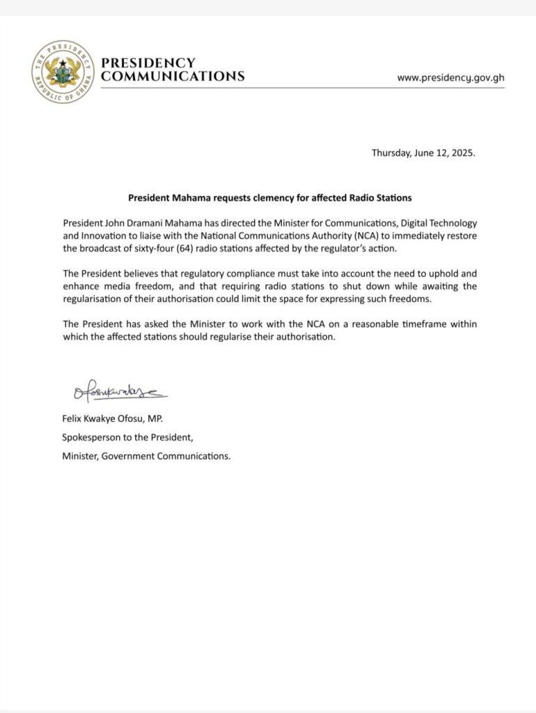 President Mahama has further instructed the Minister to collaborate with the NCA to establish a time frame within which the affected radio stations can regularise their authorisation.