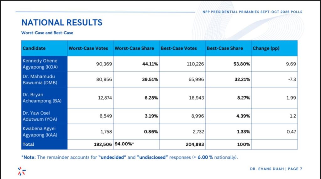 According to the survey, conducted between September 22 and October 5, 2025, Kennedy Agyapong commands between 44.11 percent (worst-case scenario) and 53.80 percent (best-case scenario) of delegate support , positioning him as the only contender likely to cross the critical 50+1 threshold. In contrast, Dr. Bawumia’s delegate support has declined to between 39.51 percent and 32.21 percent, reflecting a narrowing base since the August 2025 baseline survey.
