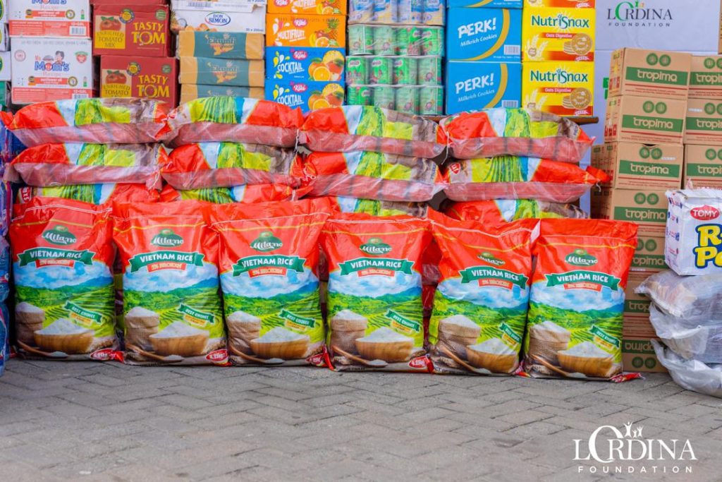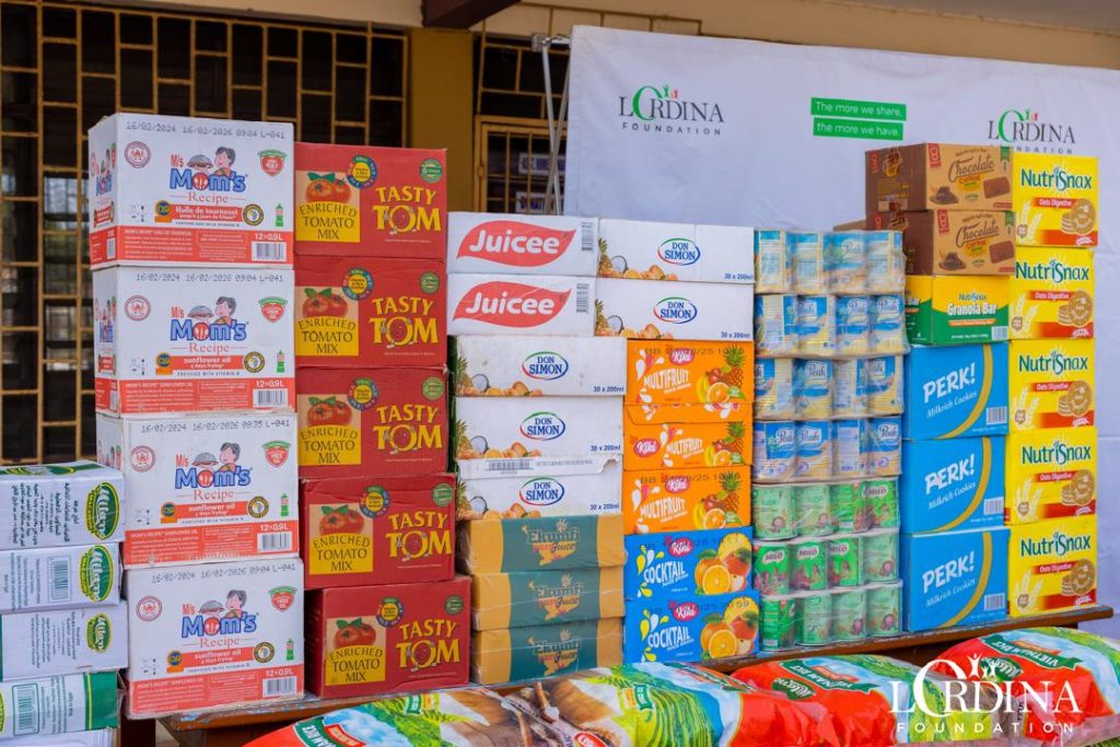 The donated items included bags of rice, cartons of cooking oil, canned tomatoes, beverages such as Milo and Nido, spaghetti, boxes of Tom Brown, sugar, biscuits, drinks, toffees, tissue paper, detergents, and sanitary pads, among other things others.