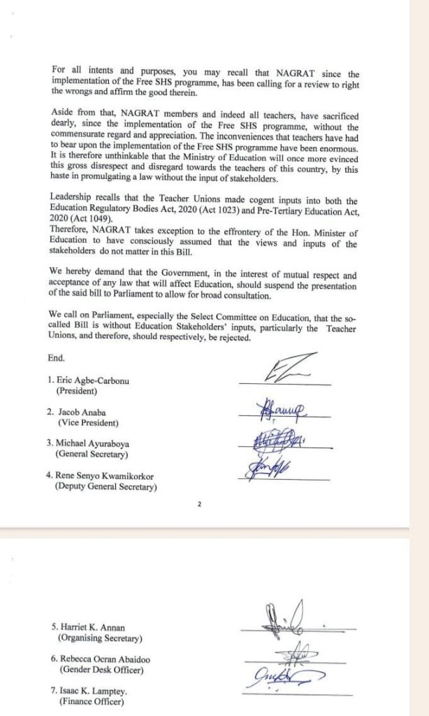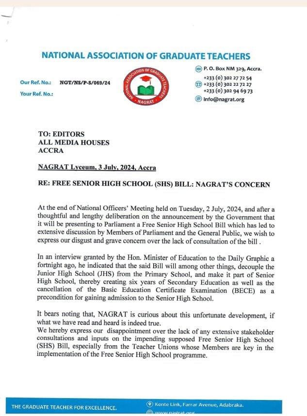 The National Association of Graduate Teachers (NAGRAT) has expressed concern over the government’s attempt to enact a law on free Senior High School (SHS) education without extensive stakeholder consultation.