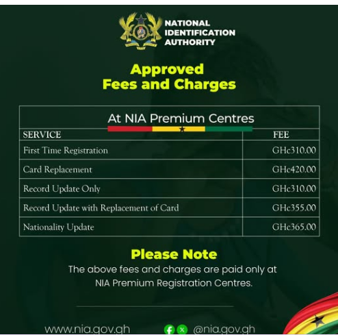 The National Identification Authority (NIA) has announced approved fees and charges for Ghana Card services at selected premium registration centres.