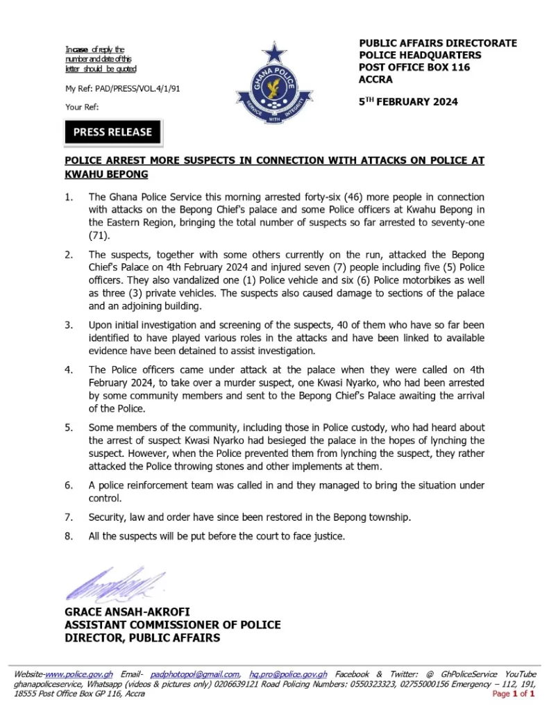 The Ghana Police Service (GPS) has apprehended forty-six more persons in connection with the attacks on the Bepong Chief’s palace and several police officers at Kwahu Bepong in the Eastern Region.