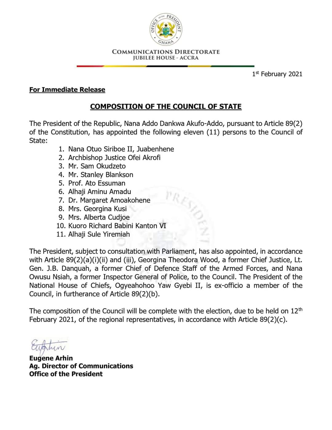 A statement from the Communication Directorate of the Jubilee House named 11 persons including the immediate past Chairman of the Council, Nana Otuo Siriboe, Juabenhene.