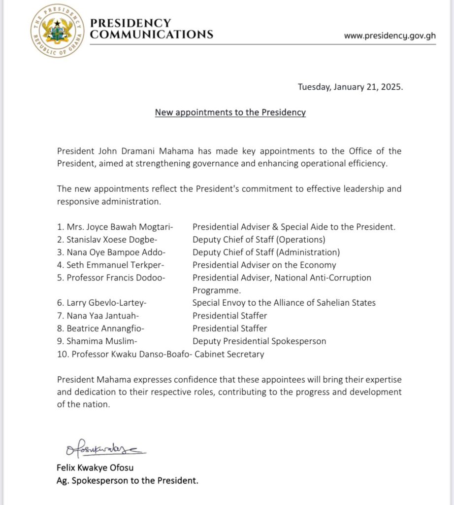 In a statement released on Tuesday, January 21, the Presidency emphasized that the appointments underscore President Mahama’s commitment to effective leadership and a responsive administration.