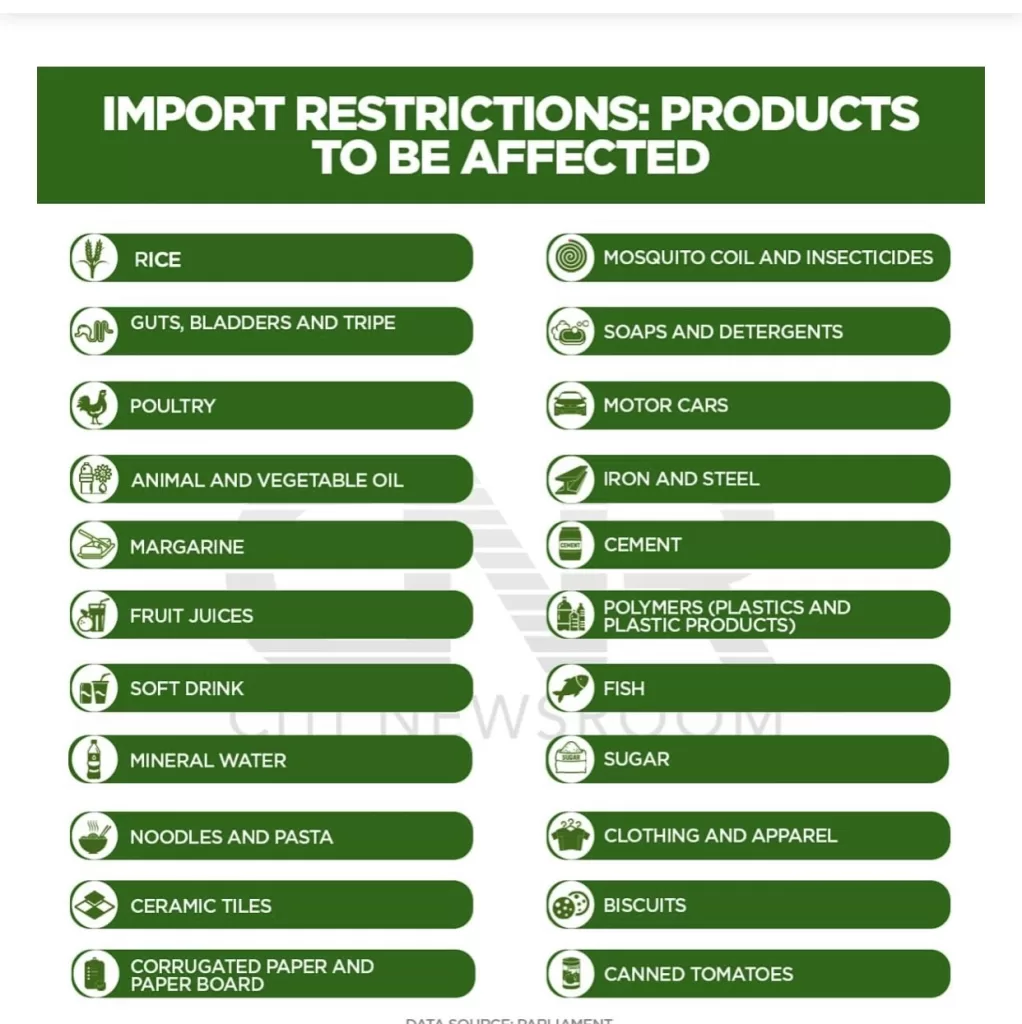 The legislation, which spans a number of items such as rice, offals (‘Yemuadie’), margarine, motor cars, soft drinks, and mosquito coils, among others.