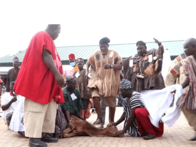 During the “jumping over a cow”, strong men hold firmly, a healthy strong cow that is lowered to the ground and the Chief, led by some spiritual men, go round the cow as Imams are vigorously reciting some verses of the Holy Quran simultaneously, until the Overlord unexpectedly jump over the cow barefooted and receives applause from the crowd. He is then taken inside his Palace to prepare to meet strangers.