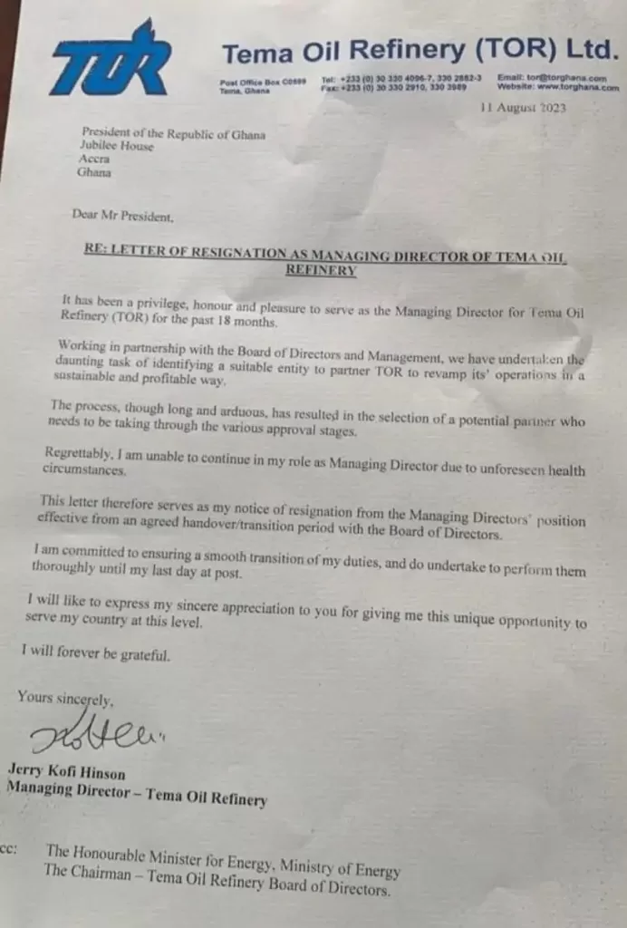 The Managing Director (MD) of the Tema Oil Refinery (TOR), Mr. Jerry Kofi Hinson, has resigned from his position as the MD of Ghana’s only Oil Refinery on health grounds, according to a letter sent to President Nana Akufo-Addo.
