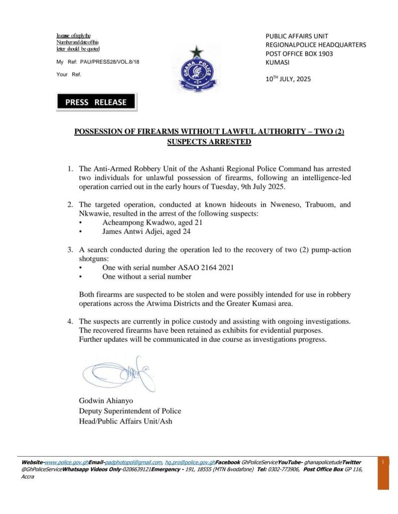 Police in the Ashanti Region have arrested two young men for having guns without permission. The arrests were made early Wednesday morning, July 9 during a special police operation based on a tip-off.