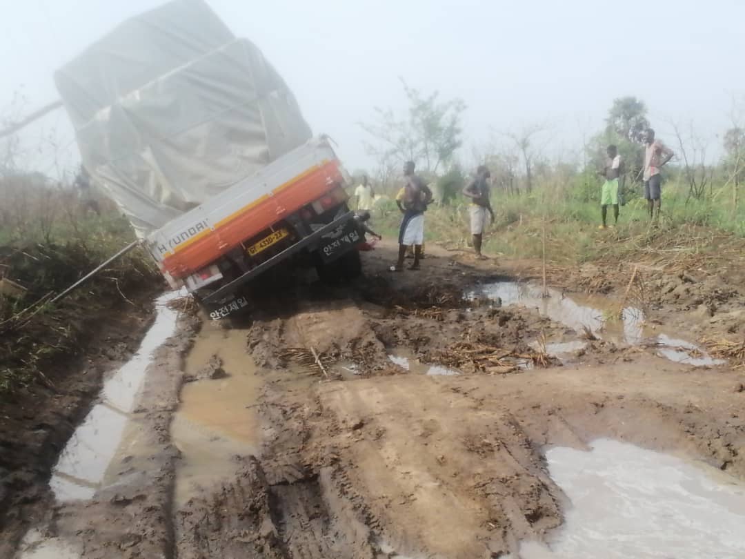 The GNA observed that a vehicle loaded with boards enroute to Dzakpo had gotten stuck in the mud at a section of the road.