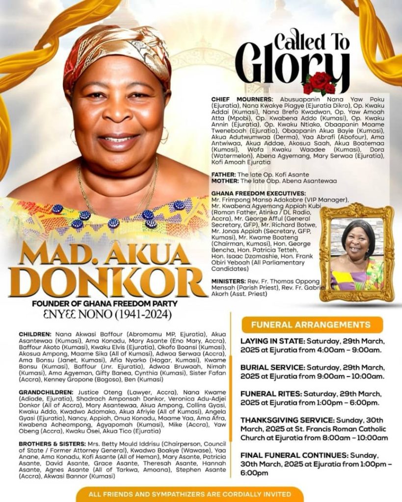 The family of Akua Donkor, founder of the Ghana Freedom Party (GFP), has announced her funeral arrangements following her passing at the age of 83.
