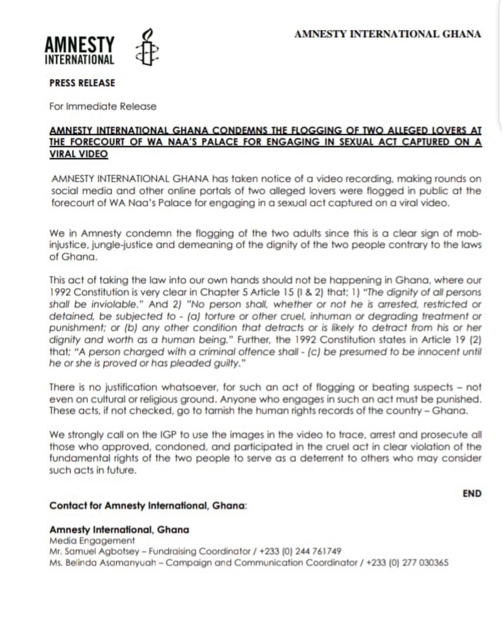 AMNESTY INTERNATIONAL GHANA has taken notice of a video recording, making rounds on social media and other online portals of two alleged lovers were flogged in public at the forecourt of WA Naa’s Palace for engaging in a sexual act captured on a viral video.