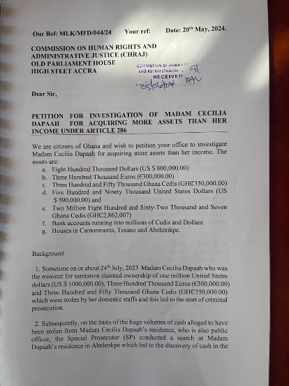 The petitioners in their request on May 20, 2024 urged CHRAJ to scrutinize Madam Dapaah’s assets, which include $1,390,000; €300,000, GH₵3,212,007; and bank accounts in both Cedis and dollars.