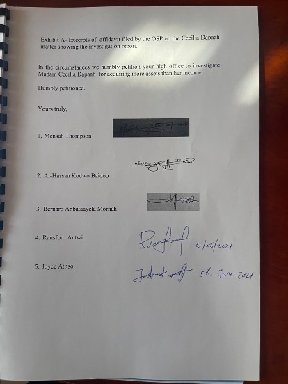The petitioners, Mr. Mensah Thompson, Mr. Al-Hassan Kwadwo Baidoo, Mr. Bernard Anbataayela Mornah, Mr Ransford Antwi, and Madam Joyce Atitso,have called for a thorough investigation into Madam Dapaah’s finances.