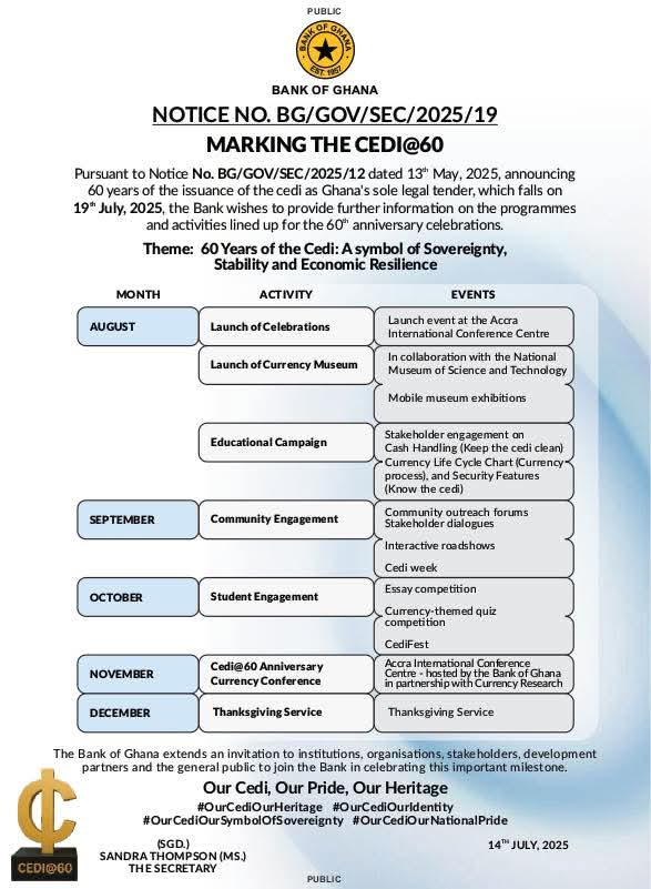 The Bank of Ghana has officially announced activities to celebrate 60 years since the cedi became Ghana’s sole legal tender. The celebration, under the theme “60 Years of the Cedi: A Symbol of Sovereignty, Stability and Economic Resilience,” will begin on Friday, July 19, 2025.