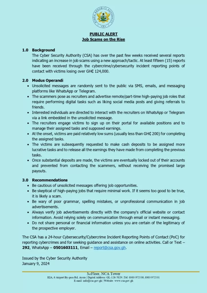 The Cyber Security Authority (CSA) is admonishing Ghanaians to be vigilant in their quest to secure lucrative jobs through agencies or online sites.