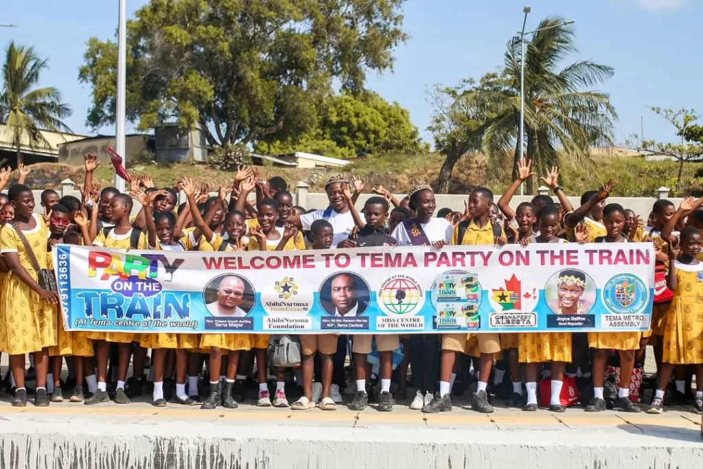 The Tema Party on the Train, gave the pupils the opportunity to walk on the Meridian bridge at the Tema Harbor railway station which is very close to the Greenwich Meridian. The children were made to experience this rail because of its significance, being the only railway line the Greenwich Meridian crossed before it met the Equator.