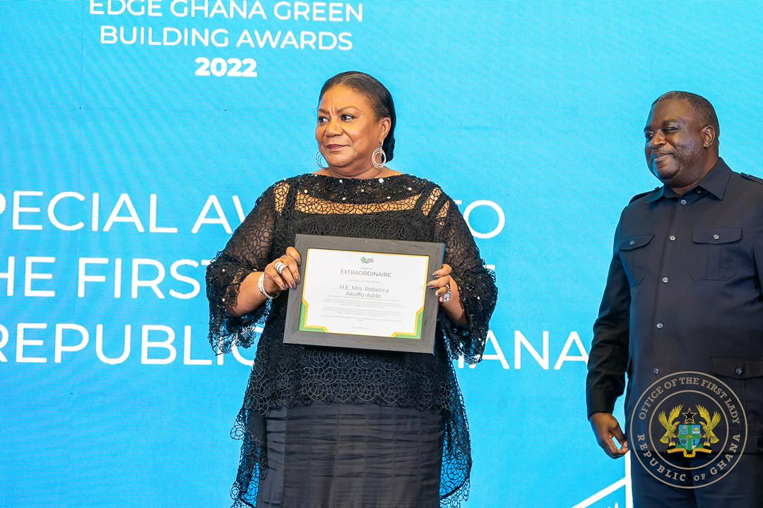 The First Lady of the Republic of Ghana, Mrs. Rebecca Akufo-Addo has been awarded for her outstanding contribution towards the Ghana Green Building Projects at the just ended IFC/ EDGE Ghana Green Building Awards, held at the Labadi Beach Hotel in Accra.