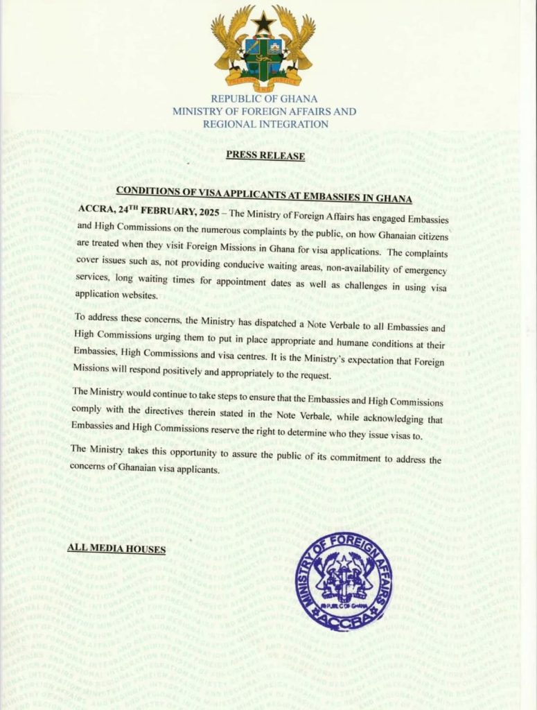 The Ministry of Foreign Affairs is demanding improved conditions for Ghanaian citizens applying for visas at foreign Embassies. The move comes in response to numerous complaints from the public regarding the treatment they receive during the visa application process.