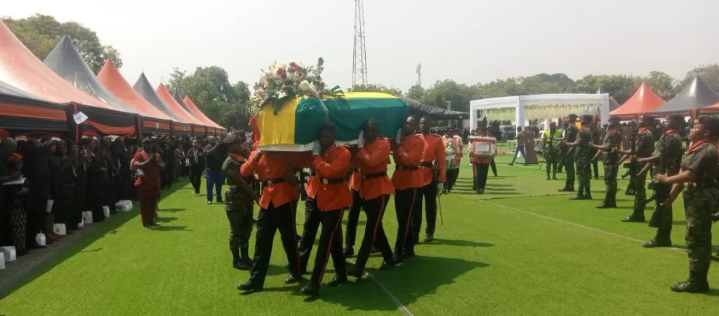 The final funeral rites of former Member of Parliament for Ningo-Prampram in the Greater Accra region, Mr. E.T Mensah began 5 January 2024 at the Forecourt of the State House in Accra.