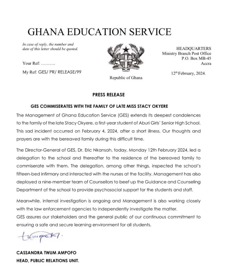 “The Director General of the Ghana Education Service (GES), Eric Nkansah, led a delegation to the school and thereafter to the residence of the bereaved family to commiserate with them,” part of the statement read.