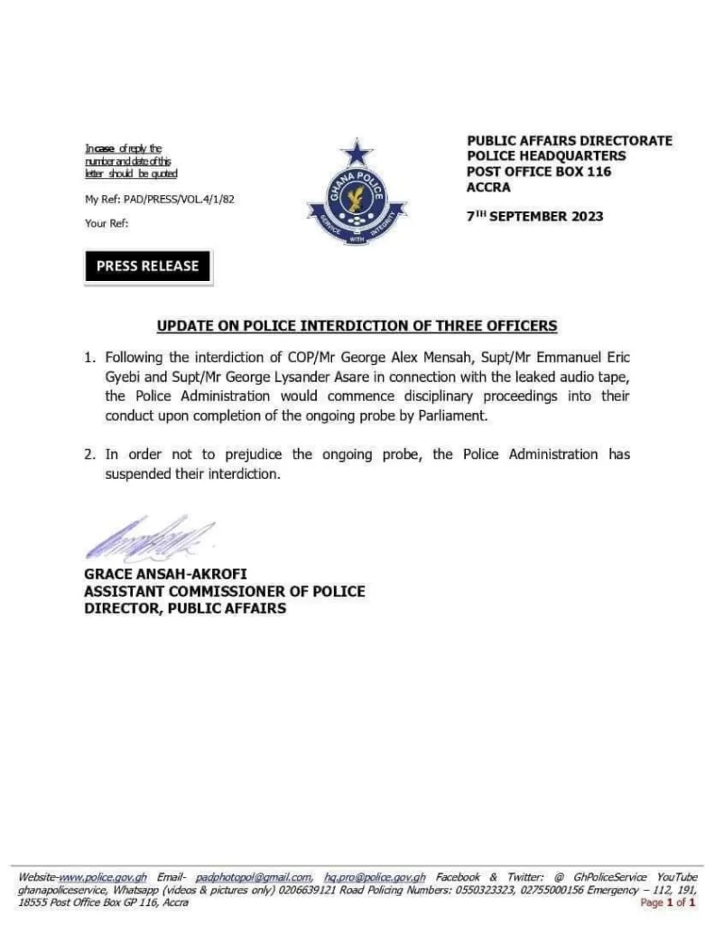 The Ghana Police Service has rescinded its earlier decision to suspend three of its senior officers—Commissioner of Police Mr. George Alex Mensah, Superintendents Emmanuel Eric Gyebi and George Lysander Asare—for their conduct in the leaked tape to allegedly remove the IGP.