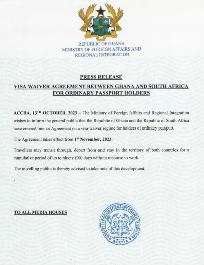 The Ministry of Foreign Affairs and Regional Integration advises the traveling public to be aware of this significant development, as it will undoubtedly facilitate smoother travel between Ghana and South Africa for ordinary passport holders.