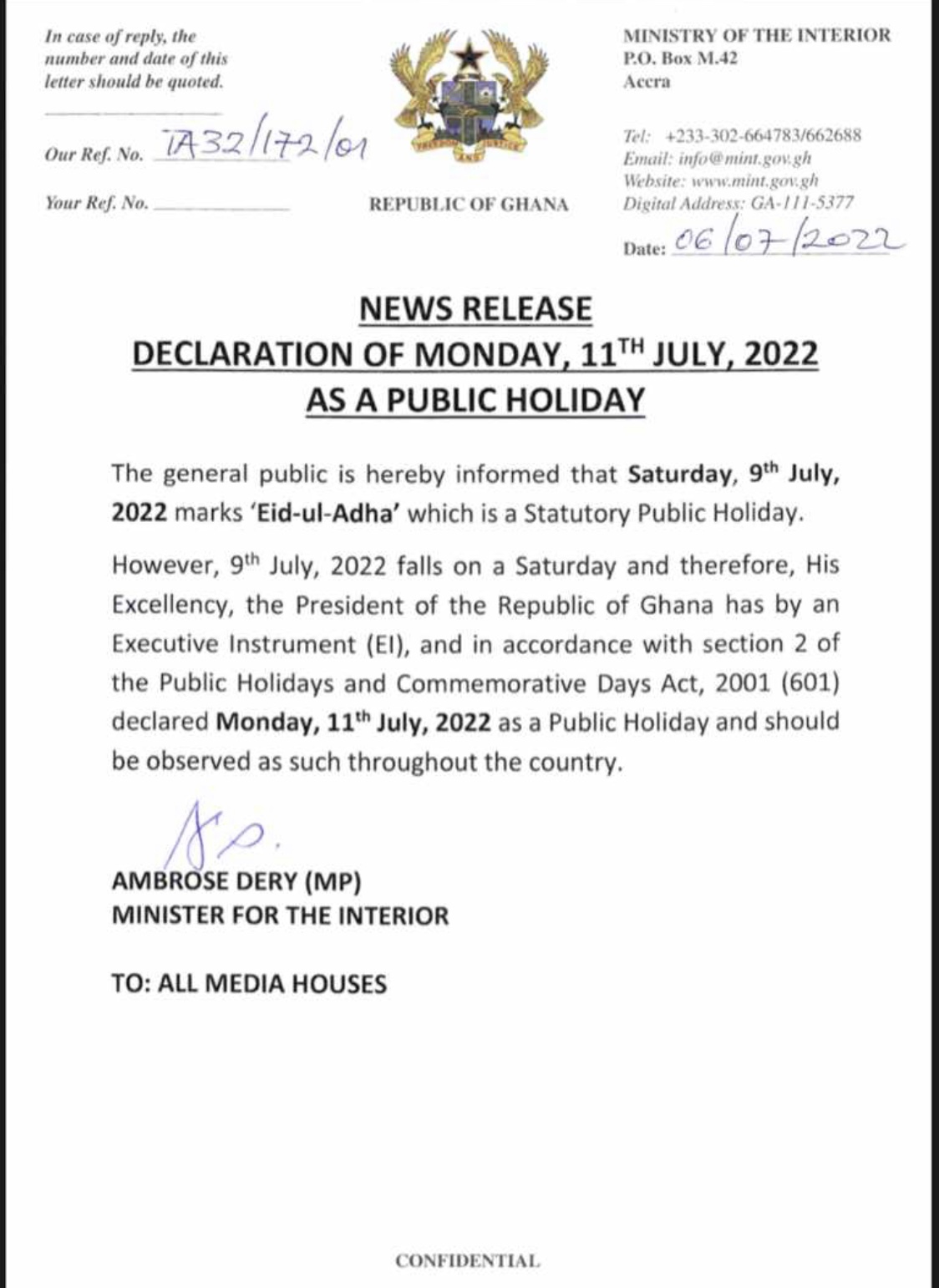 The information was contained in a statement issued by the Interior Minister, Ambrose Dery, on July 6.