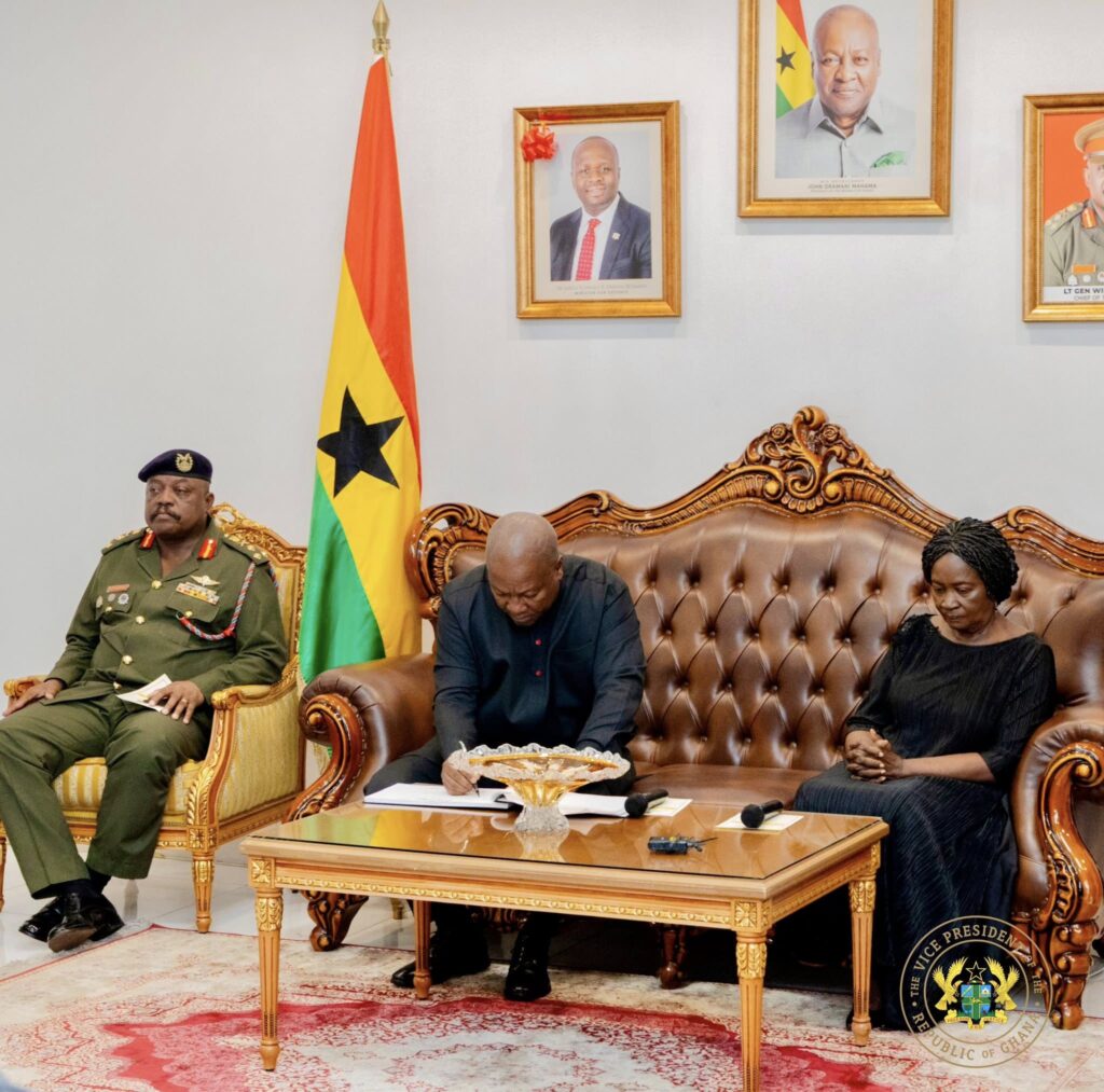 In a solemn show of national unity and compassion, President John Dramani Mahama, accompanied by Vice President Jane Naana Opoku-Agyemang and other senior government officials, visited the office of the Chief of Defence Staff, Major General William Agyapong, to extend heartfelt condolences to the families of the fallen military personnel.