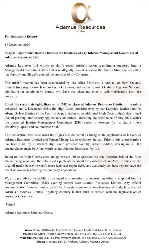 Adamus Resources Limited has refuted recent claims regarding the existence of an Interim Management Committee (IMC) at its Nzema Mine, emphasizing that the High Court has rendered such assertions baseless and void.