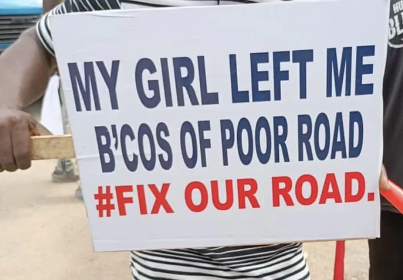 The protesters are seen with placards with some inscriptions such as, “ My girl left me because of poor roads, “ Drivers are suffering passengers are suffering “ among others.