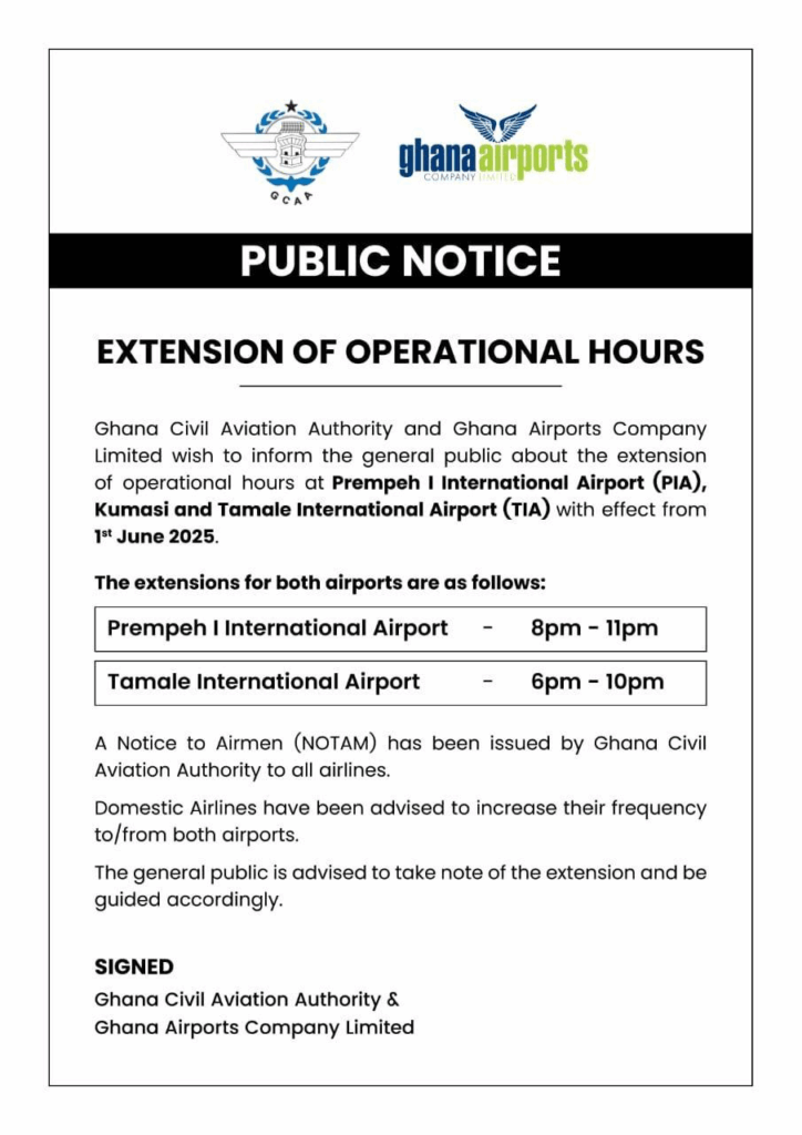 The Ghana Civil Aviation Authority (GCAA) and the Ghana Airports Company Limited (GACL) have extended operating hours for Kumasi’s Prempeh I International Airport and the Tamale International Airport, effective 1 June 2025.