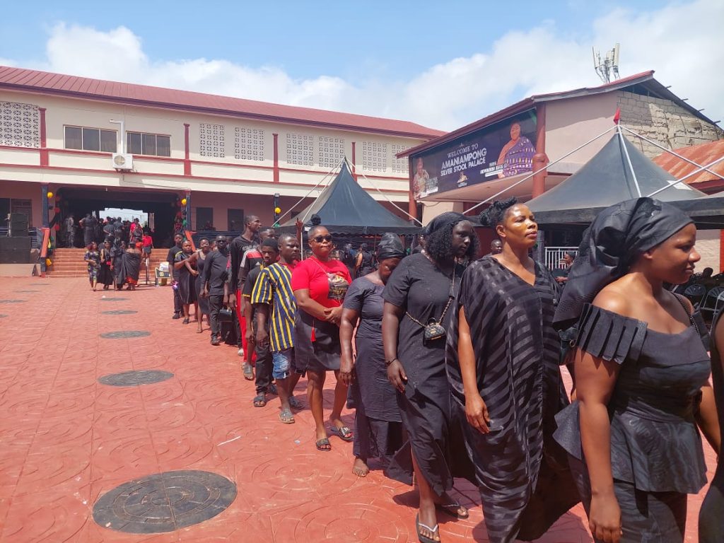 Nana Agyakoma Difie led the filing past, joined by sub-chiefs of the Mampong Traditional Area and paramount queen mothers from the Ashanti and Bono regions. The widow and her daughter mourned their loved one in an atmosphere of solemnity.