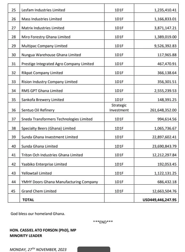 In a statement issued on Monday, November 27, 2023, the Minority said the government was asking Parliament to grant tax exemptions to the tune of USD 449,446,247.95 for these 45 companies, which is equivalent to over half of GH¢5.5 billion.