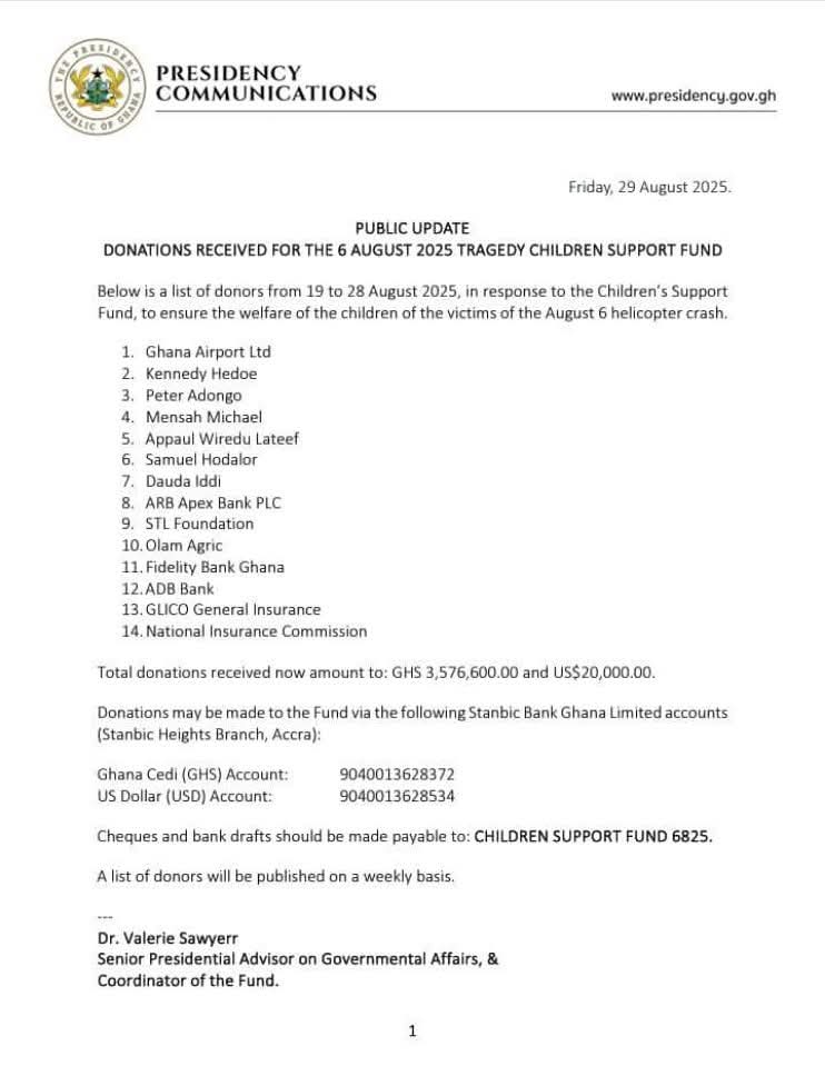 Donations to the Children’s Support Fund established for the welfare of the children of victimss of the August 6, 2025 helicopter crash have exceeded GHS 3 million.