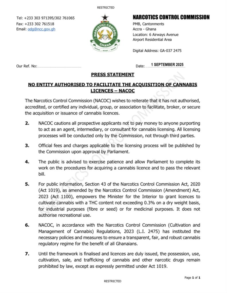 In a press statement signed by the Acting Director of Public Affairs and International Relations, Francis Opoku Amoah, NACOC stressed that it has not authorised any entity to broker or secure cannabis licences on its behalf.