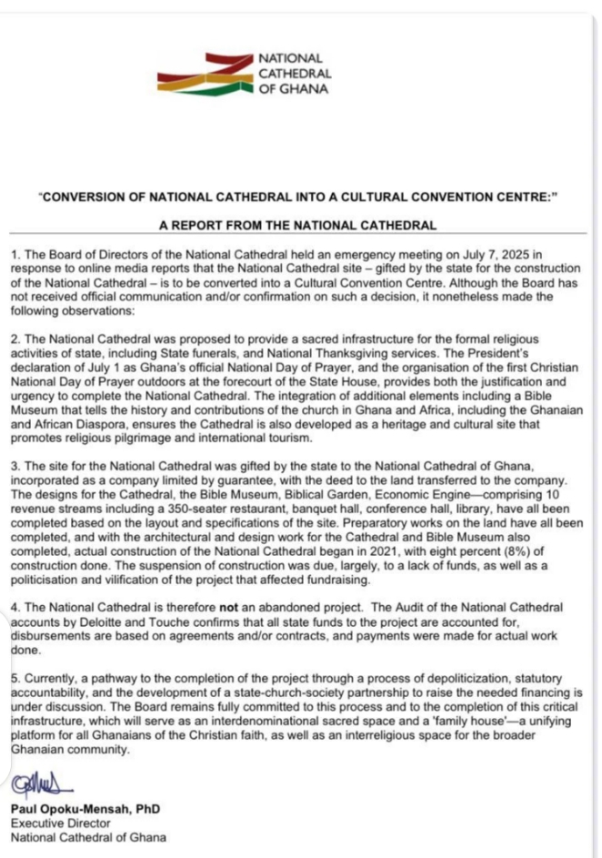 The Board of Directors of the National Cathedral of Ghana has dismissed media reports suggesting that the site for the National Cathedral will be turned into a Cultural Convention Centre.