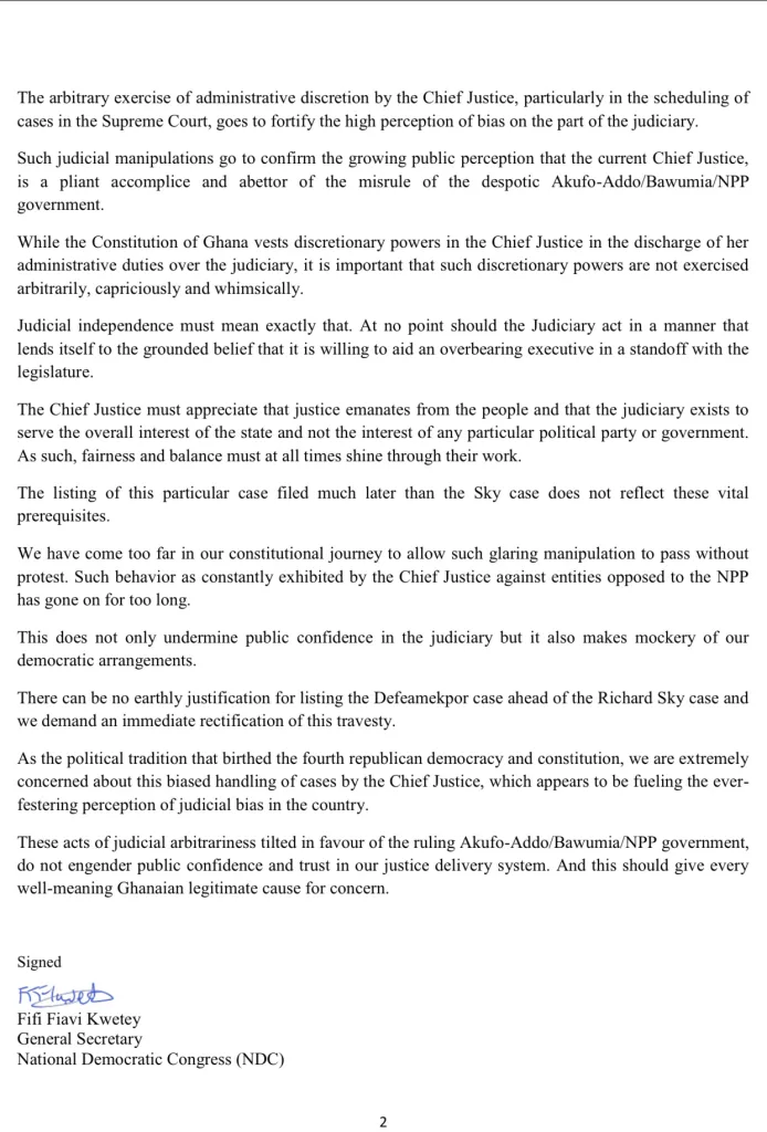The National Democratic Congress (NDC) has voiced concerns regarding the scheduling of political cases by the Chief Justice.