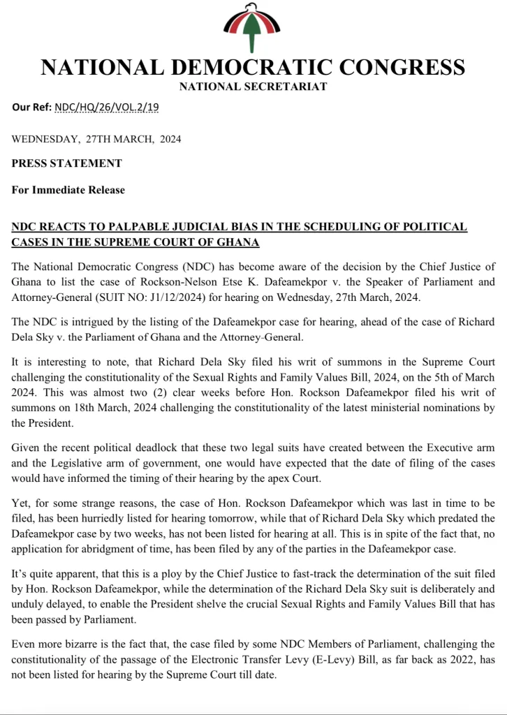 In a press release issued by the NDC today, March 27, 2024, they expressed apprehension over certain decisions made by the Supreme Court, alleging “palpable bias” in the arrangement of cases with political ramifications.