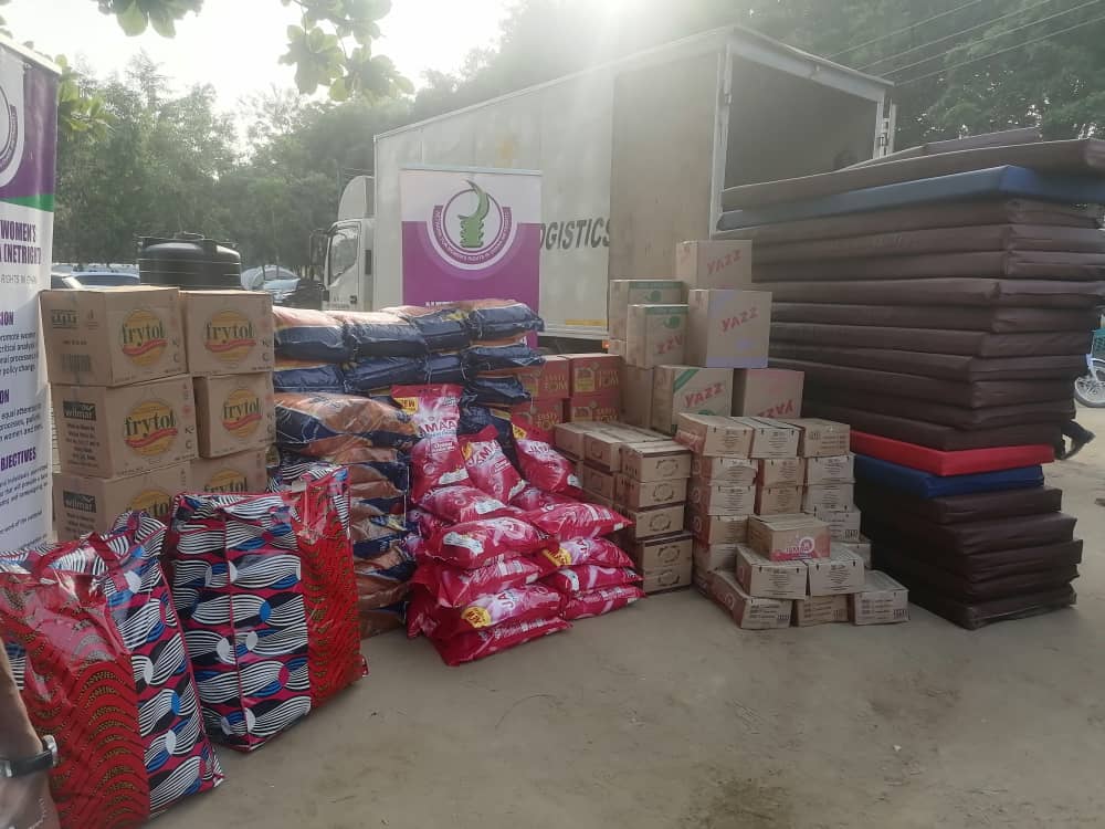 The items included bags of rice, mattresses, bags of gari, tin tomatoes, yazz sanitary pads, frytol oil, bar soap, washing powder, bathing soap, mackerel and bags of sachet water.