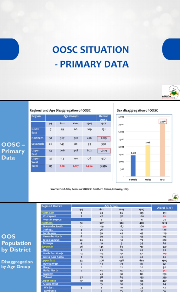 Data for the census was collected in March 2025, using a mixed-method approach combining household censuses, community-level checklists, key informant interviews, and focus group discussions with education officials, parents, and community leaders. The findings were validated at a stakeholder workshop held at the University for Development Studies (UDS) in Tamale on October 30, 2025.
