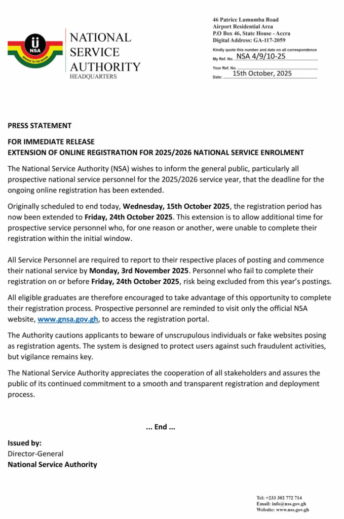 The National Service Authority (NSA) has announced an extension of the deadline for the online registration of prospective national service personnel for the 2025/2026 Service Year.
