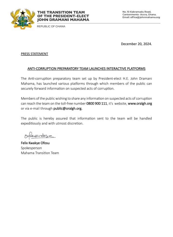 The announcement was made on Friday, December 20, by Felix Kwakye Ofosu, spokesperson for Mahama’s Transition Team. He revealed that the initiative allows the public to report corruption confidentially.