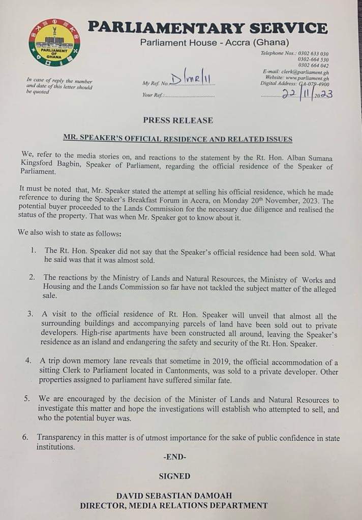 In a response to the claims by the Speaker, the Lands Commission, Lands and Natural Resources Ministry debunked that the residence was almost sold to a private developer and promised an investigation into the matter.
