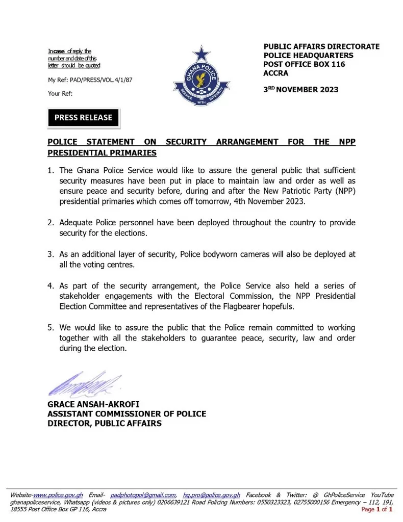 The Ghana Police Service has given the general public an assurance that its adequately prepared to maintain law and order during the New Patriotic Party’s flagbearer contest scheduled for Saturday, November 4.