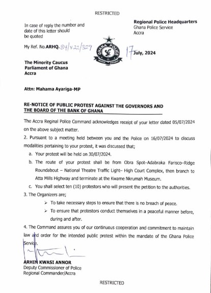The Ghana Police Service (GPS) has given the leadership of BoG protesters led by the National Democratic Congress (NDC) Minority Caucus in parliament the green light to stage their protests on July 30, 2024.