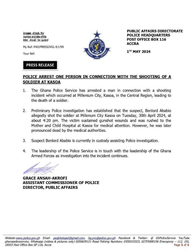 Preliminary Police investigation has established that the suspect, Benlord Ababio, allegedly shot the soldier at Millenum City Kasoa on Tuesday, 30th April 2024, at about 4:20 p.m. The victim sustained gunshot wounds and was rushed to the Mother and Child Hospital at Kasoa for medical attention. However, he was later pronounced dead by the medical authorities.