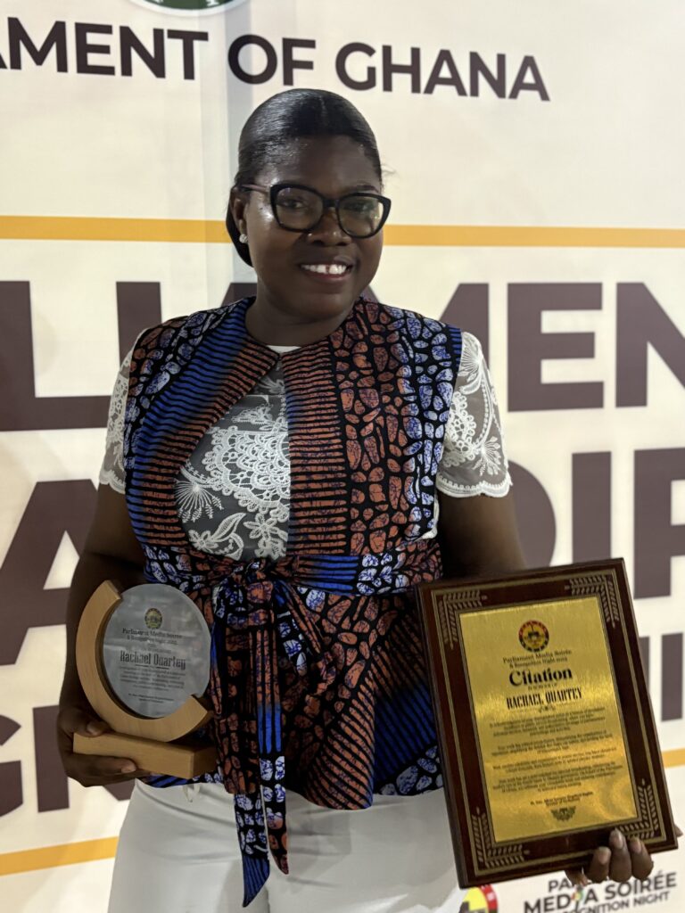 The Parliament of Ghana has honoured Rachel Quartey, a Parliamentary Correspondent with the Ghana Broadcasting Corporation, in recognition of her distinguished and dedicated coverage of parliamentary proceedings over the years.