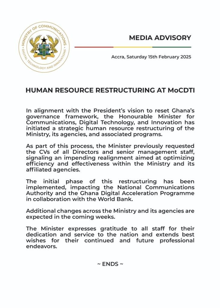 “The first phase of this restructuring has been executed, impacting the National Communications Authority and the Ghana Digital Acceleration Programme in collaboration with the World Bank,” the statement noted.