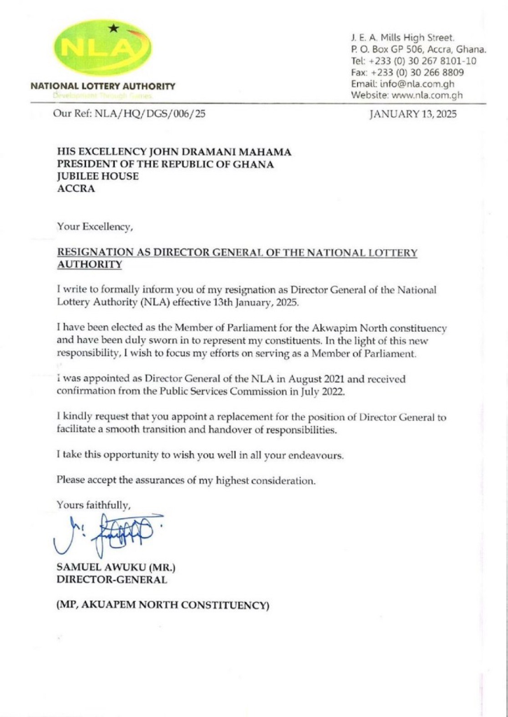 The Director General of the National Lottery Authority (NLA), Sammy Awuku, has officially tendered his resignation, effective Monday, January 13, 2025.