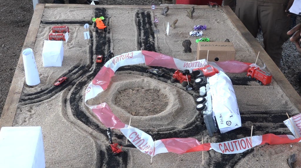 This incident occurred in the peak hours of a working day where business activities were brisk, traffic was at gridlocks and people were seen rushing to the scene. With the sand model, Team Chaley was to assume it to be the incident ground while performing the role as incident responders.